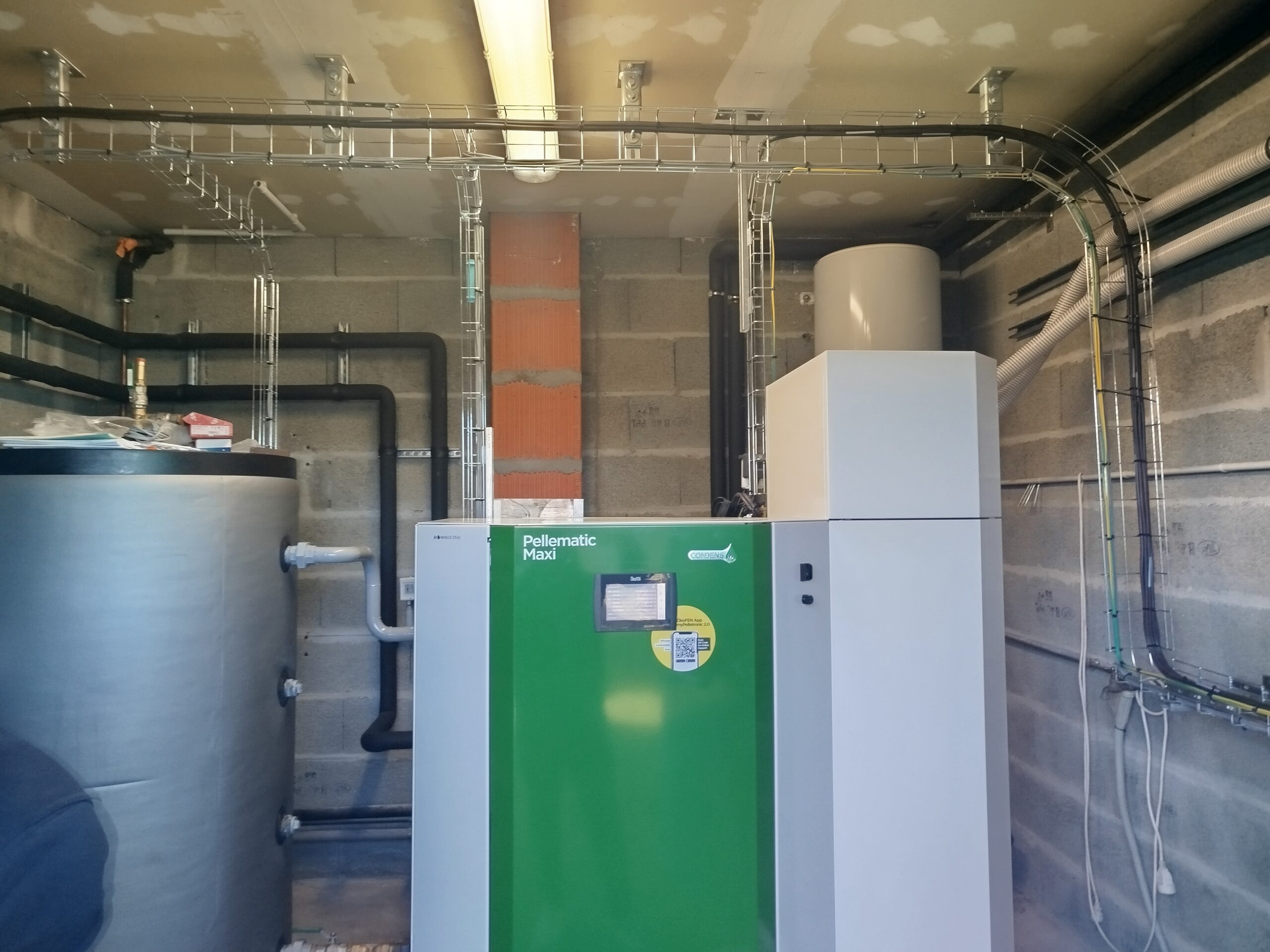 Mise en place d’une chaudière à granulés bois Ökofen Pellematic Maxi Condens de 64 kW (modèle PESK64). Nos équipes ont assuré le positionnement de la chaudière, les raccordements hydrauliques, les branchements électriques et l’ensemble des connexions nécessaires au bon fonctionnement du système.